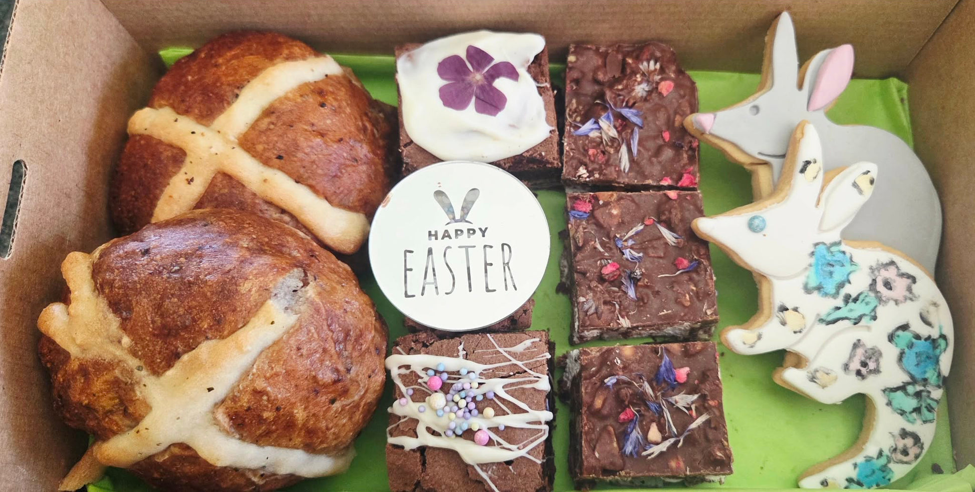 Hot Cross Buns are best enjoyed within 3 days, brownies within 7-10 days and the biscuits and rocky road are best within 3-4 weeks.
